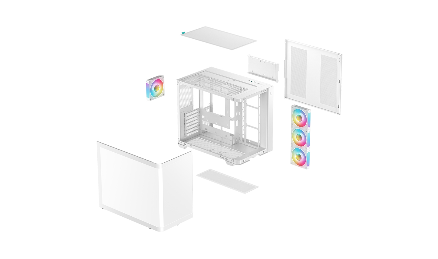 CG530U 4F WH は、デュアルチャンバー設計を採用した曲面ガラス製パノラマケースです。4 基の ARGB ファンがプリインストールされており、効果的なエアフローと照明を実現する準備が整っています。